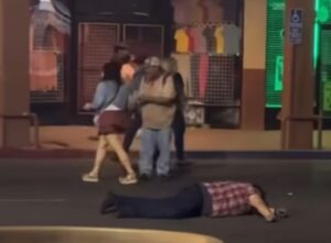 The footage shows a chaotic scene involving a group of men and women engaged in a brawl steps away from the pedestrian crossing. At one point in the video, several individuals can be seen punching and kicking a man until he collapses onto the street, appearing unconscious.